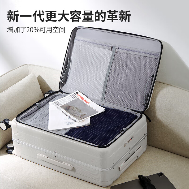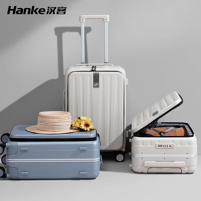 汉客行李箱男拉杆箱女旅行箱69升大容量24英寸象牙白镇店前侧开盖铝框价格:709.00元!