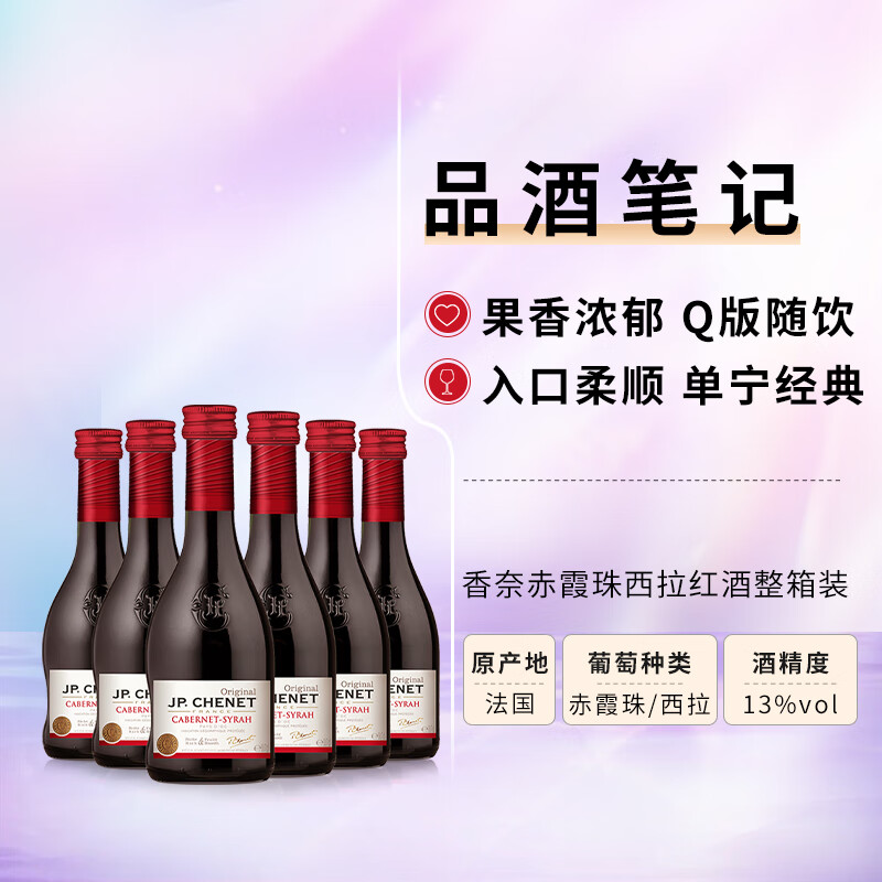香奈(J.P.CHENET)赤霞珠西拉红葡萄酒 187ml*6 整箱装价格:199.00元!