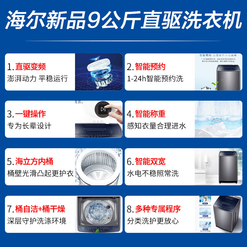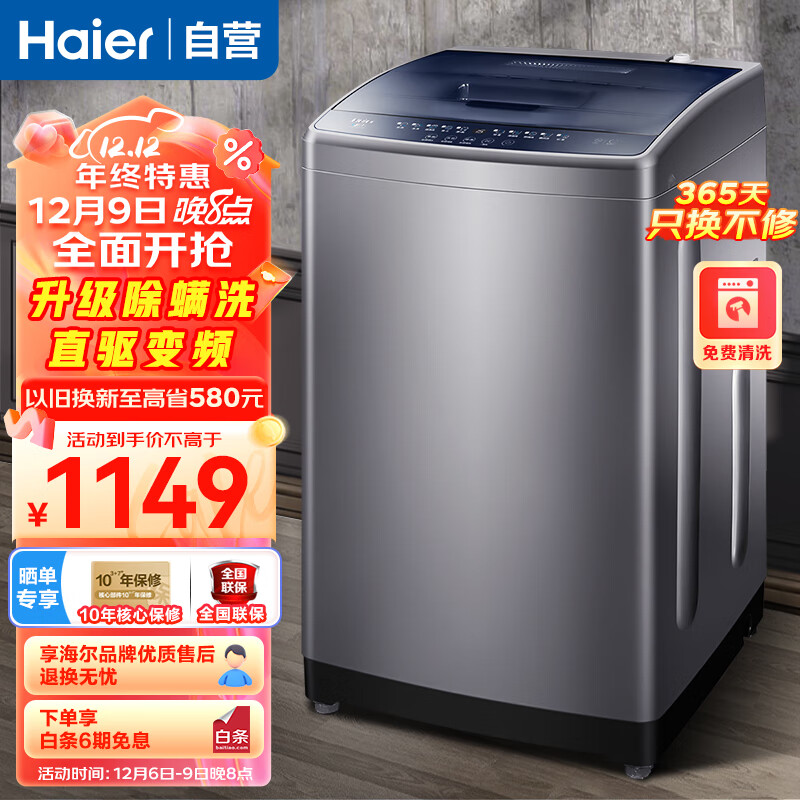 海尔(Haier)9KG波轮洗衣机全自动变频节能一级能效水电双宽家用租房洗衣机可视上盖洗漂一体价格:1149.00元!