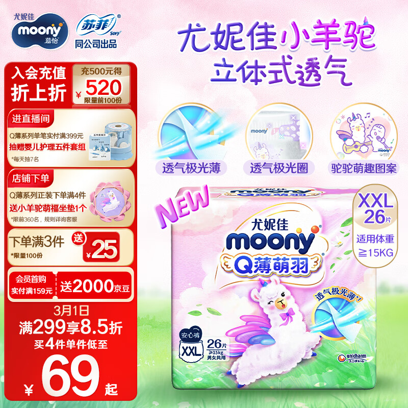 MOONY 尤妮佳Q薄萌羽小羊驼拉拉裤XXL26片(15kg及以上) 透气轻芯超薄价格:93.30元!