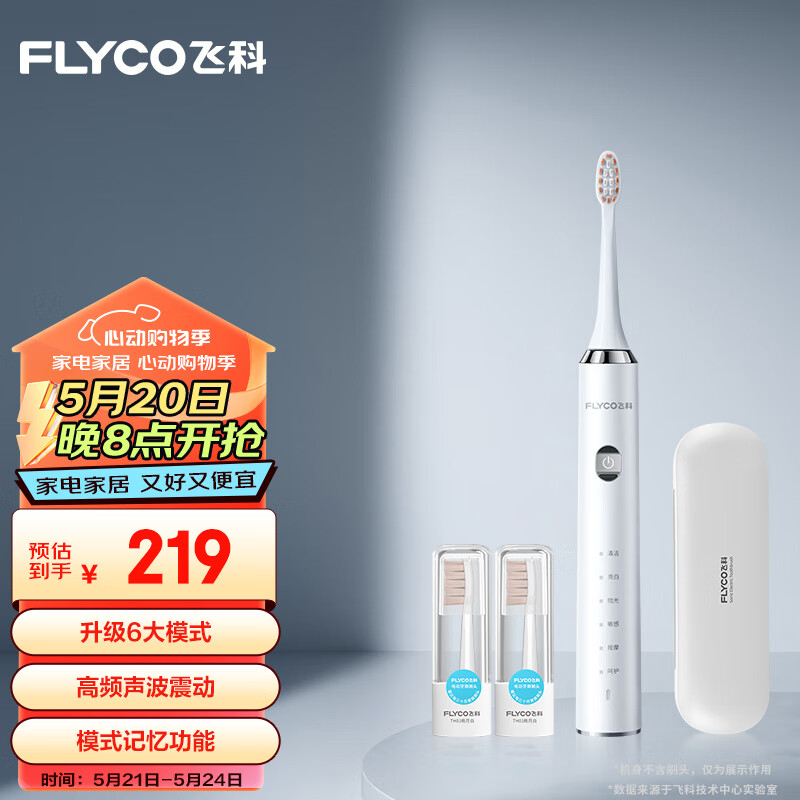 飞科(FLYCO)电动牙刷成人全自动声波软毛牙刷深层清洁智能计时情侣款送男友送女友520情人节礼物FT7205皓月白价格:329.00元!