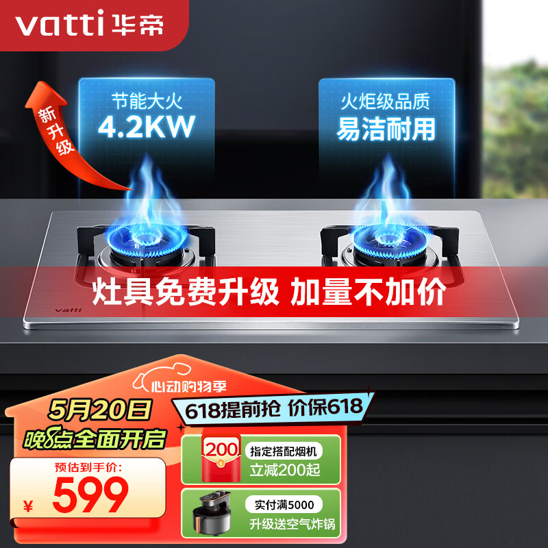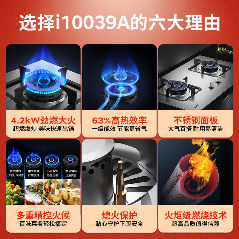 华帝(VATTI)燃气灶家用台式嵌入式两用 4.2kW大火力不锈钢面板煤气灶双灶台灶具JZY-i10039A(液化气)价格:579.00元!