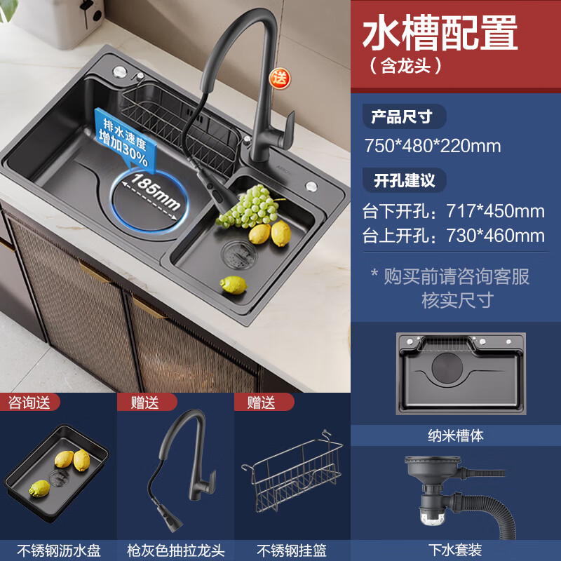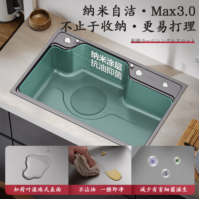箭牌(ARROW)304不锈钢日式水槽大单槽洗菜盆纳米台上台中台下洗碗池 75*48纳米单槽-冷热枪灰抽拉龙头价格:1829.00元!