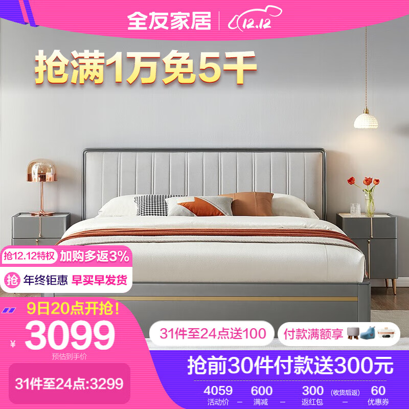 全友家居 现代轻奢软靠科技布双人床主卧大床婚床127702 1.8米不带抽床B+127701-2床头柜D*2+105169床垫价格:4059.00元!