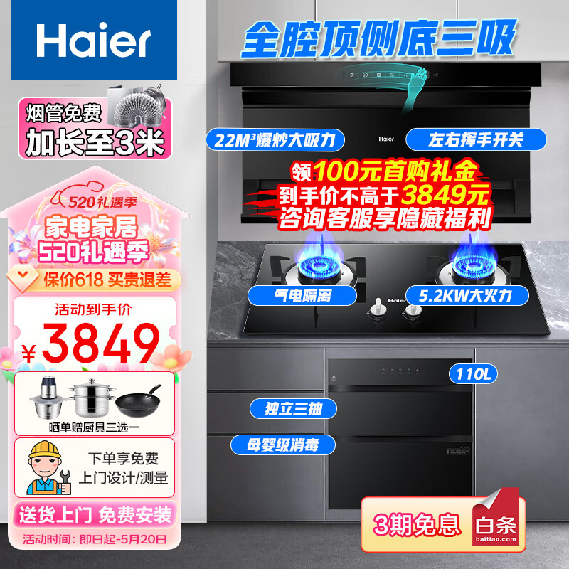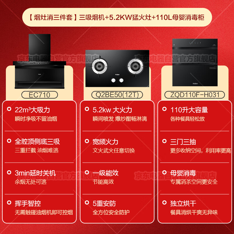 海尔(Haier)顶侧双吸烟灶消三件套 22立方大吸力烟机 5.2kW灶 110升家用嵌入式消毒柜EC710+Q2BE50+H031[家电]价格:4149.00元!