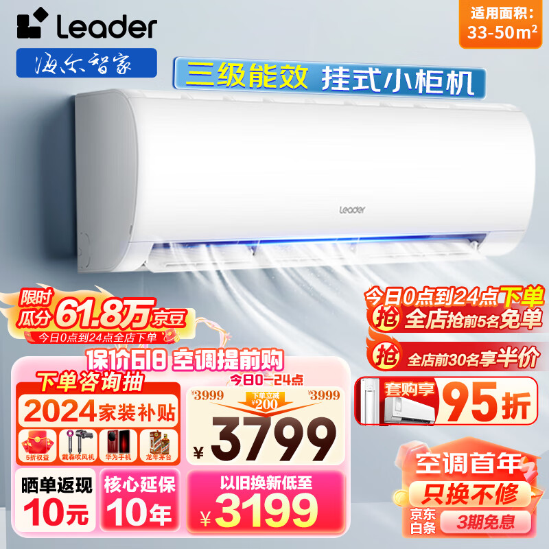 Leader空调海尔空调出品 3匹新三级客厅变频空调挂式 WIFI智控 30秒速热 自清洁空调挂机72MDA83价格:3799.00元!