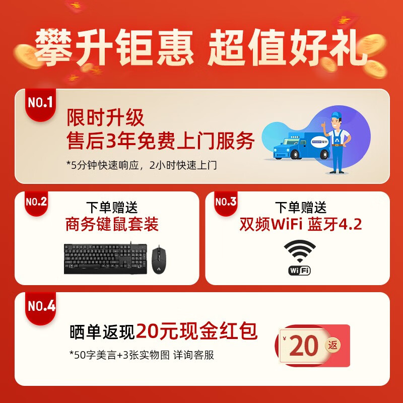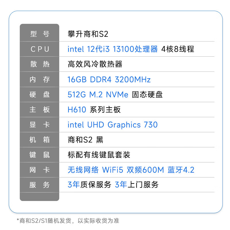 攀升商和S2 办公商用台式电脑全套整机(13代i3-13100 16G 512G WiFi 键鼠 3年上门)单主机diy组装机价格:2299.00元!