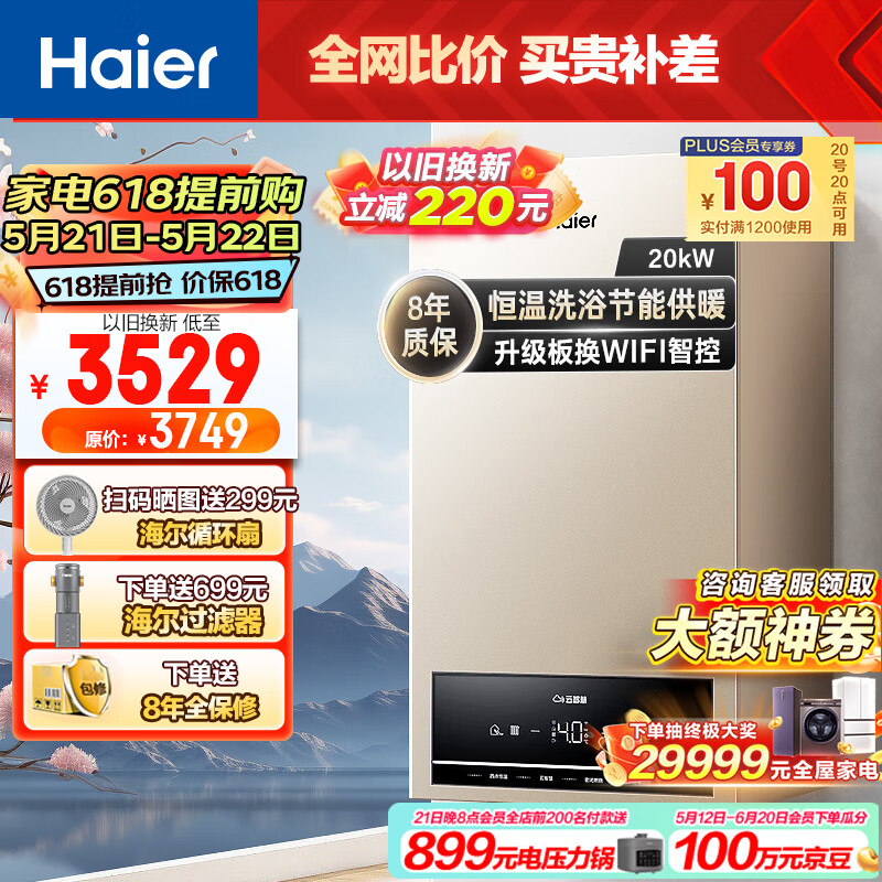 海尔(Haier)燃气壁挂炉天然气板换式采暖炉家用地暖供暖全屋热水智慧节能 WIFI智控多点恒温L1PB20-HJ5ACHMU1价格:3799.00元!