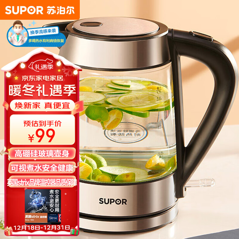 苏泊尔(SUPOR)玻璃电水壶热水壶高硼硅玻璃电热水壶 1.7L烧水壶 SWF17E26A价格:99.00元!
