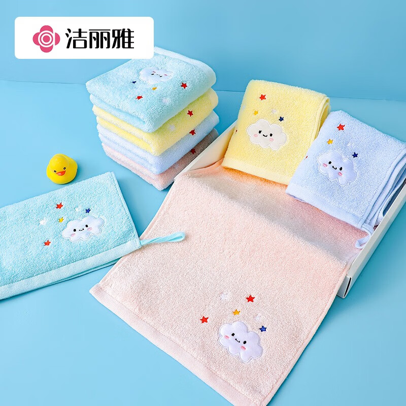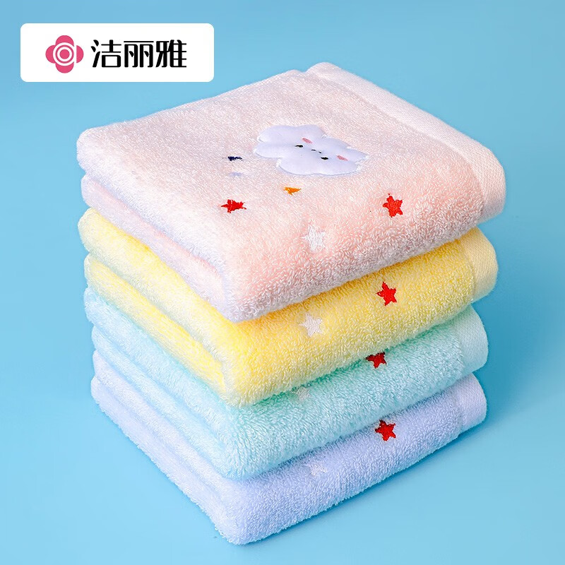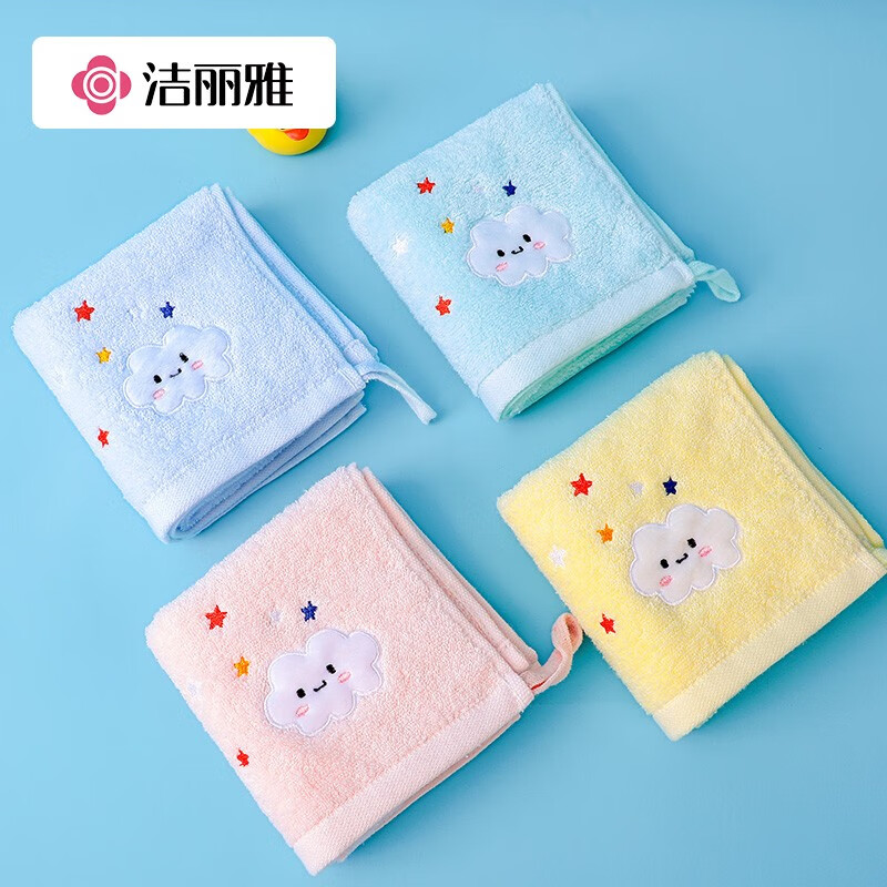 洁丽雅A类婴儿毛巾4条装 新疆纯棉洗脸洗澡巾卡通云朵小面巾童巾带挂钩价格:36.90元!