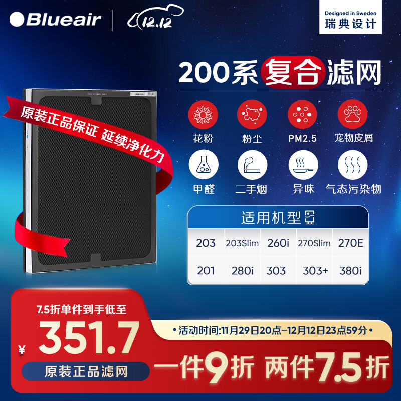 布鲁雅尔Blueair空气净化器过滤网滤芯 NGB复合滤网适用270E/303/303+【配件】价格:469.00元!