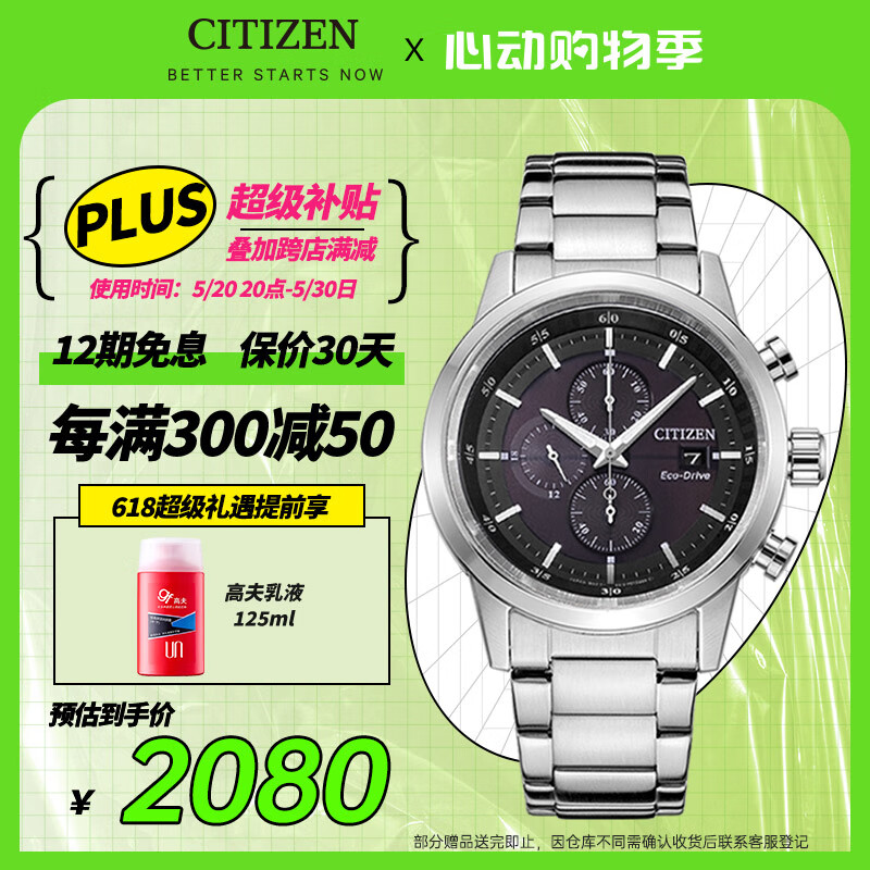 西铁城(CITIZEN)手表男日韩表光动能三眼黑盘日显钢带商务情人节礼物CA0610-52E价格:2490.00元!
