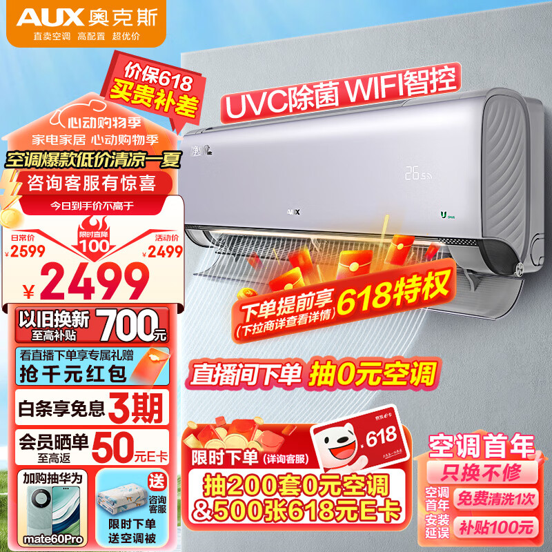 奥克斯(AUX)1.5匹净享风Pro+空调 新一级能效 家用冷暖壁挂式 紫外线除菌KFR-35GW/BpR3DQE1(B1)WiFi智控价格:2499.00元!