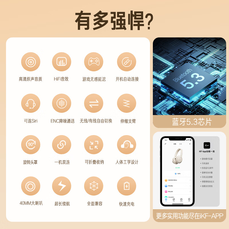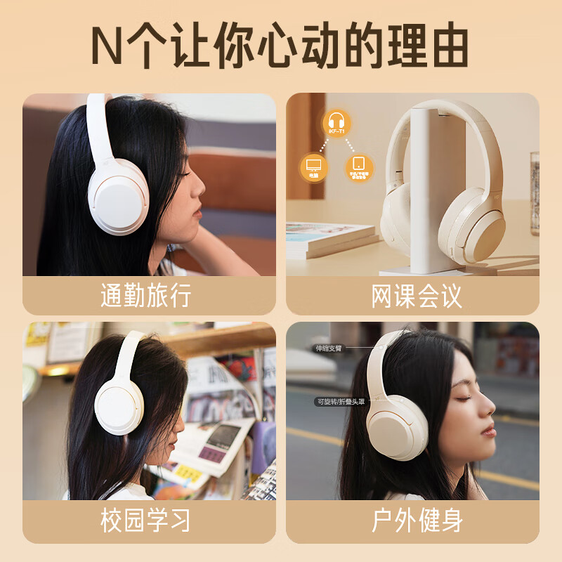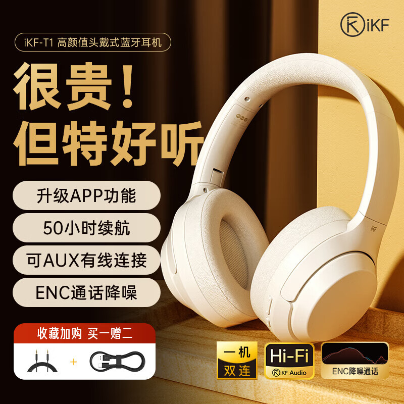 iKF T1【智能互联APP】头戴式无线蓝牙耳机通话降噪耳机有线高音质音乐游戏运动电脑网课耳机云岩白价格:129.00元!