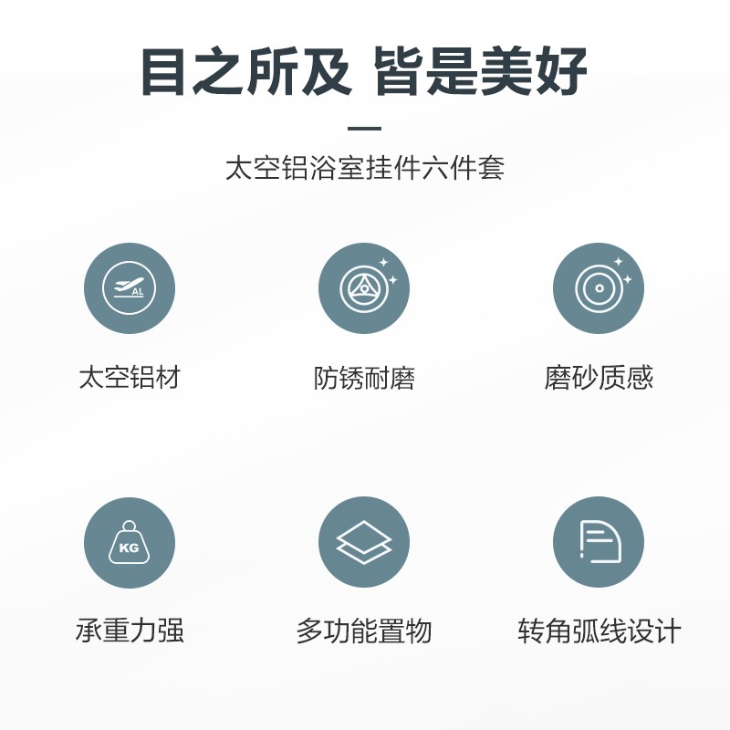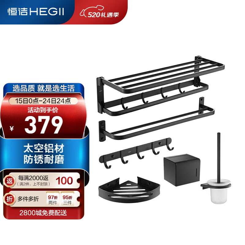 恒洁(HEGII)毛巾架免打孔 卫生间置物架浴室挂件套装太空铝六件套915K06-BC价格:379.00元!