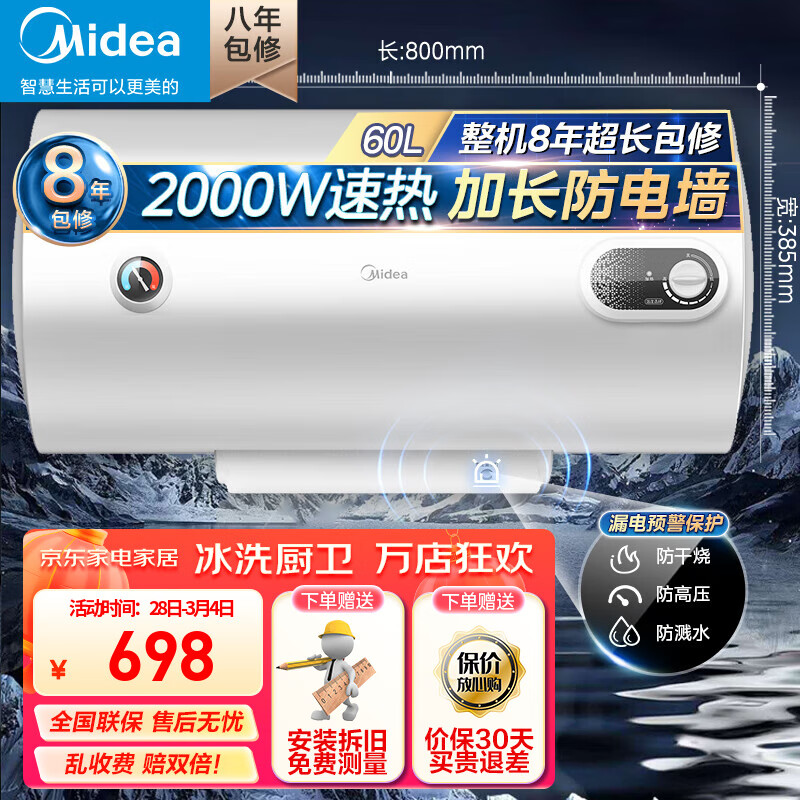 美的(Midea)储水式电热水器家用洗澡高效速热出租屋节能省电健康洗浴小型储水式防漏电A3 60升3-4人洗【2000W速热防电墙】价格:698.00元!