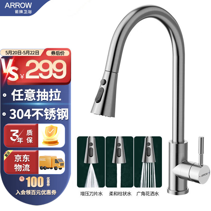 箭牌(ARROW)厨房水龙头冷热抽拉式水龙头 厨房龙头AE4589MSS价格:288.97元!