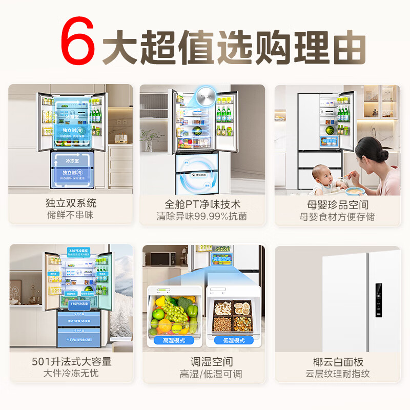 华凌 美的冰箱出品多门法式526【508青春版】一级能效全舱PT净味双循环大容量母婴冰箱HR-526WFPZ价格:3299.00元!