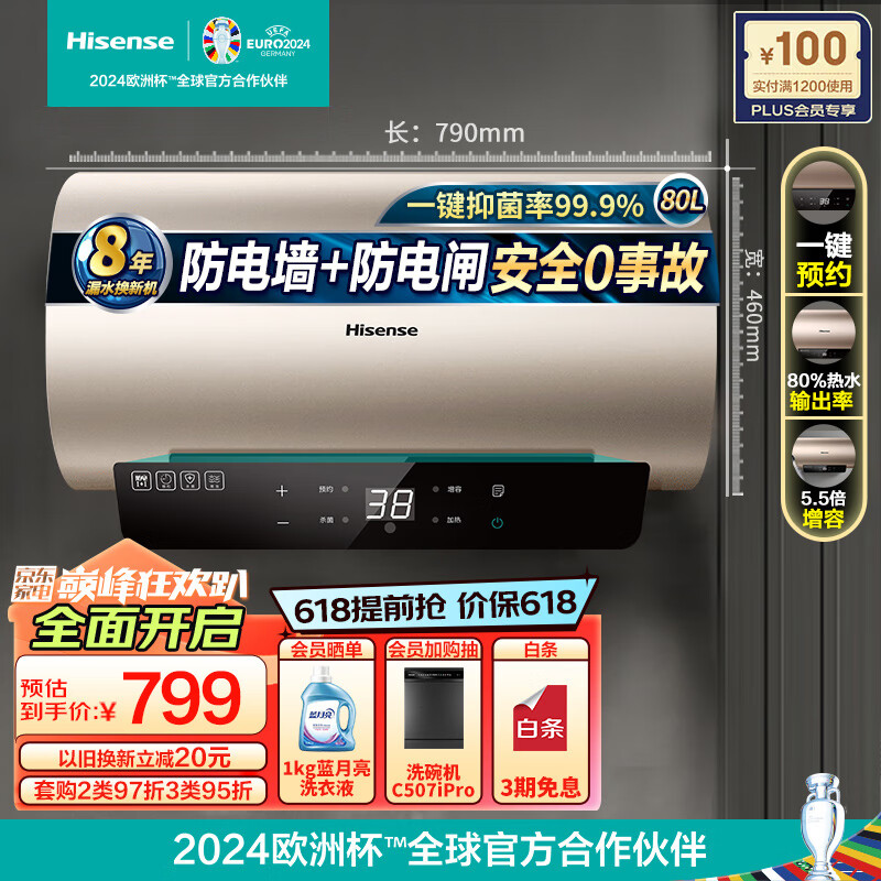 海信(Hisense)80升家用电热水器2100W速热5.5倍增容大屏触控自清洁智能预约双重防电保护DC80-W1513T以旧换新价格:799.00元!