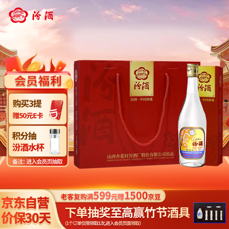 汾酒 出口玻汾礼盒 清香型白酒 53度 500ml*4瓶 礼盒送礼价格:269.00元!