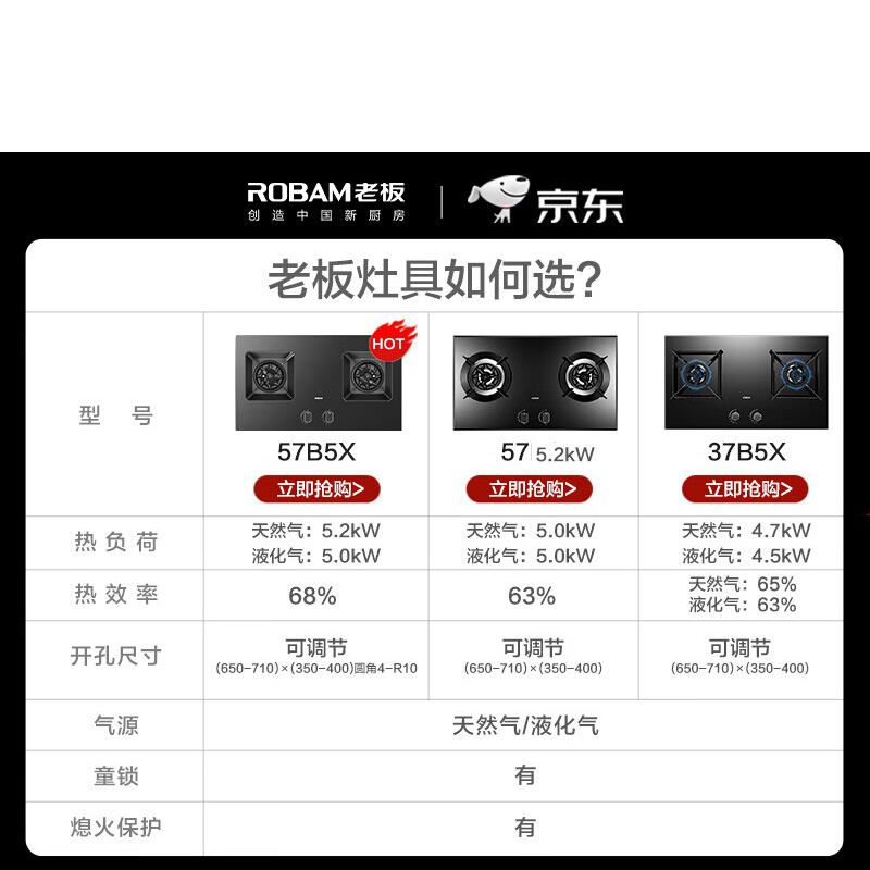 老板(Robam)燃气灶57B5X家用5.2kW超大火力68%高热效【王一博同款】易打理嵌入式可调节底盘 一级能效 5.2kW可调节天然气价格:1899.00元!