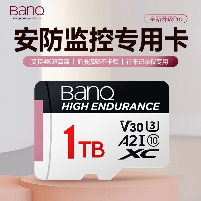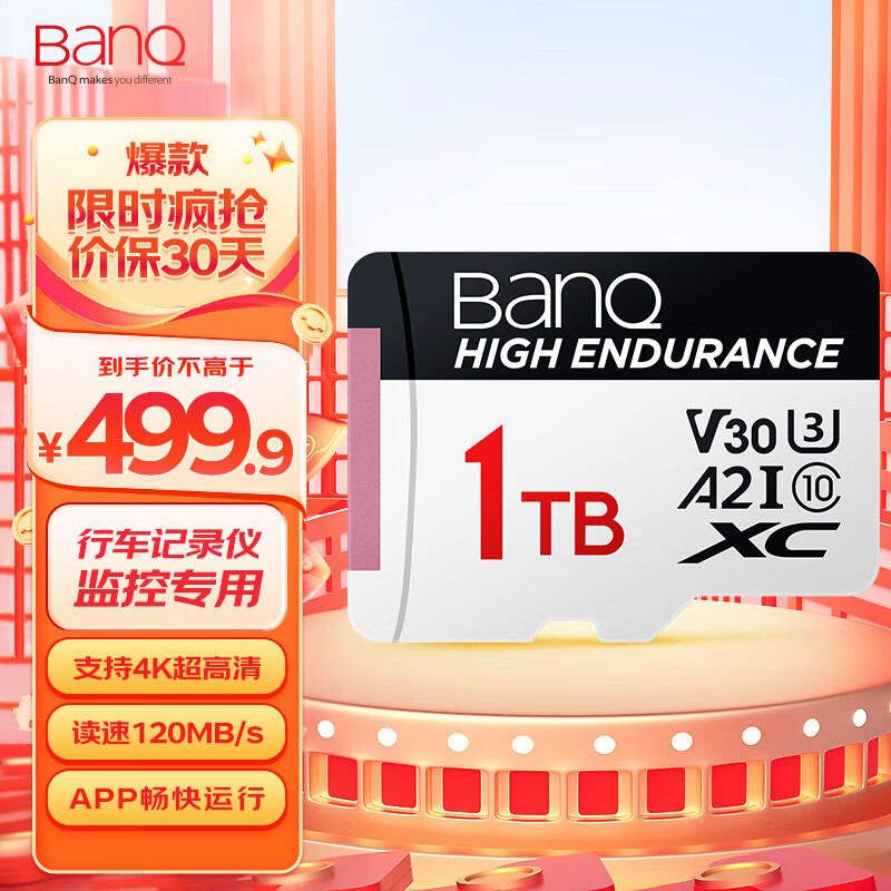 banq 1TB TF(MicroSD)存储卡 A2 U3 V30 4K 行车记录仪&安防监控专用内存卡 高度耐用价格:499.90元!