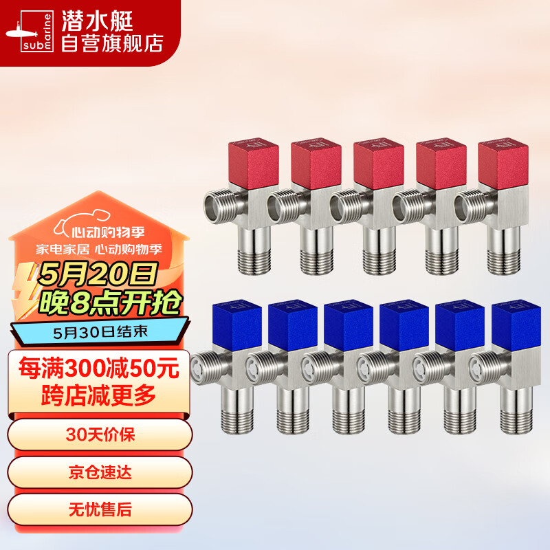 潜水艇(Submarine)F3012-11黄铜加厚三角阀八字阀陶瓷阀芯红蓝标国标4分6冷+5热11只价格:409.00元!