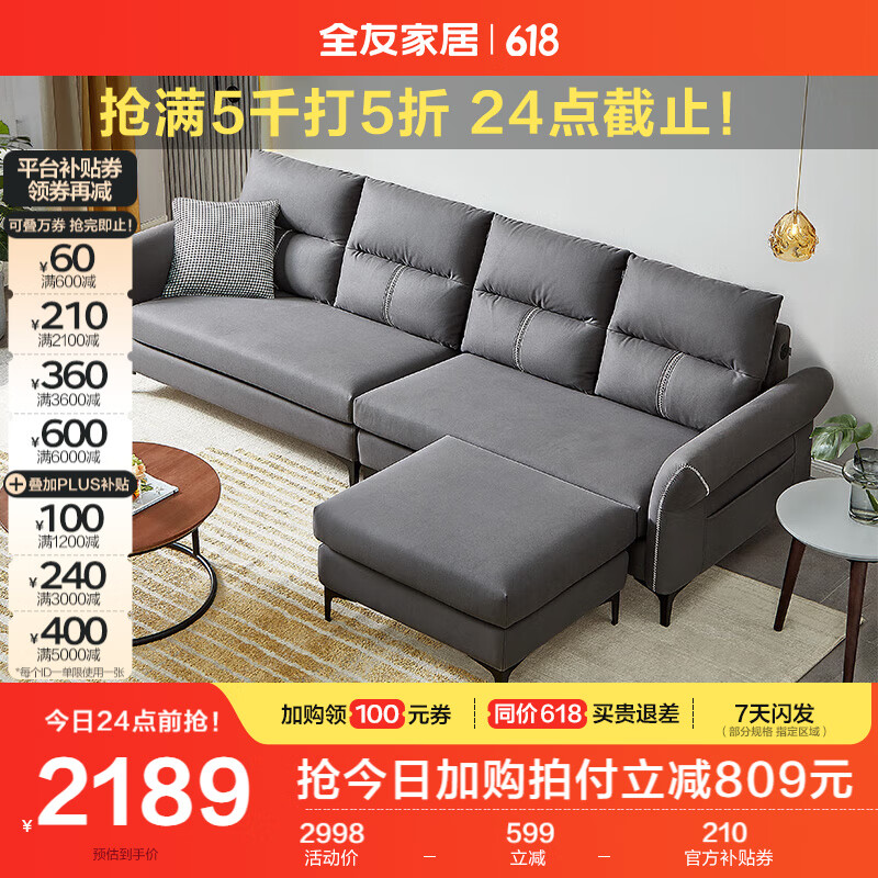 全友家居 现代简约功能科技布艺可拆洗储物小户型直排沙发客厅102679价格:2998.75元!