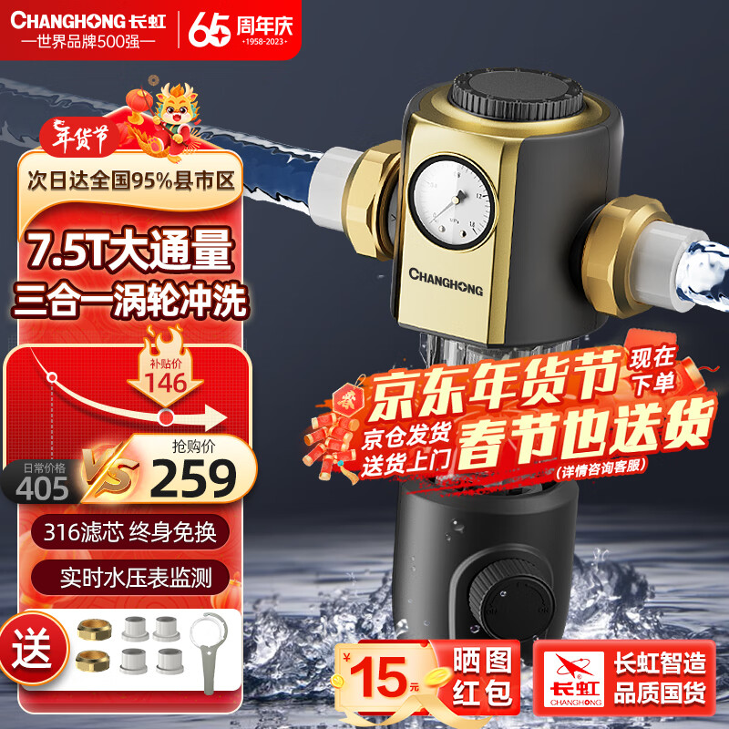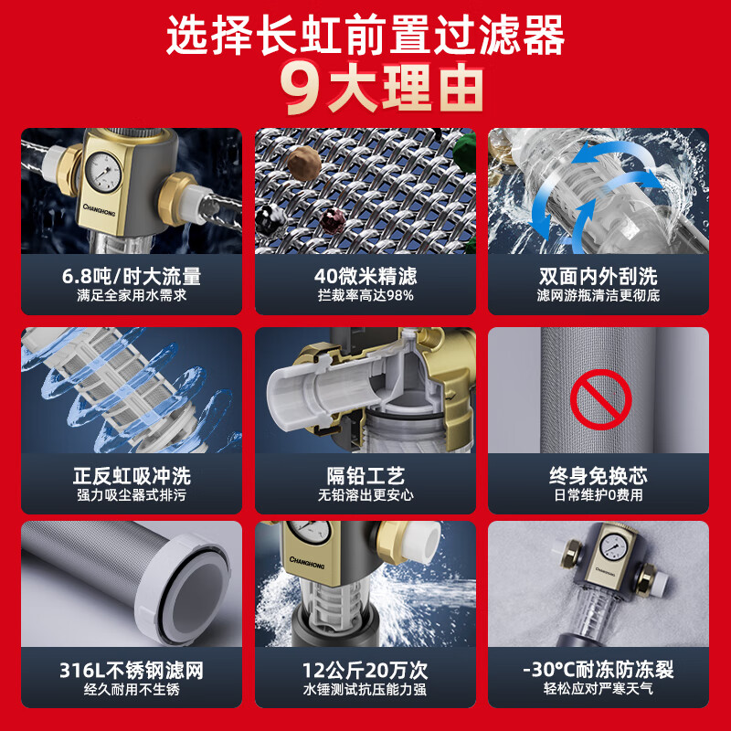 长虹(CHANGHONG)7.5T前置过滤器正反冲洗40微米家用净水器全屋中央净水机全铜大流量 自行安装【三合一涡轮冲洗】价格:405.00元!