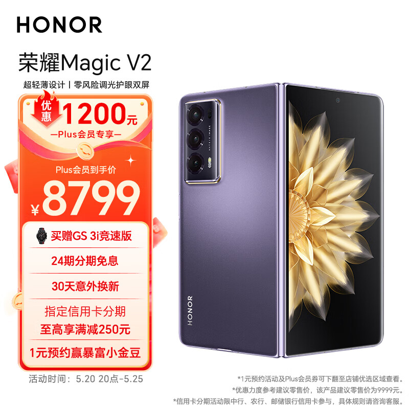 荣耀Magic V2 折叠屏 超轻薄设计 零风险调光护眼双屏 5000mAh青海湖电池 5G AI手机 16+512 绒紫色价格:9999.00元!