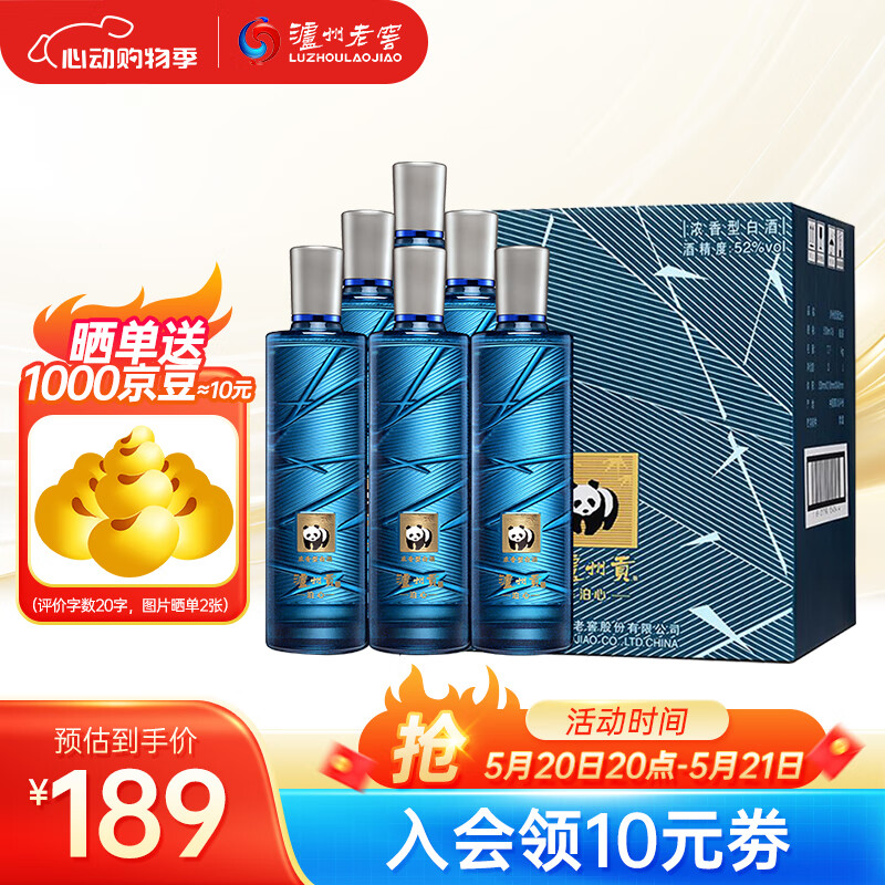 泸州老窖泸州贡泊心浓香型纯粮食白酒52度500ml*6瓶 熊猫酒(含礼品袋)价格:189.00元!