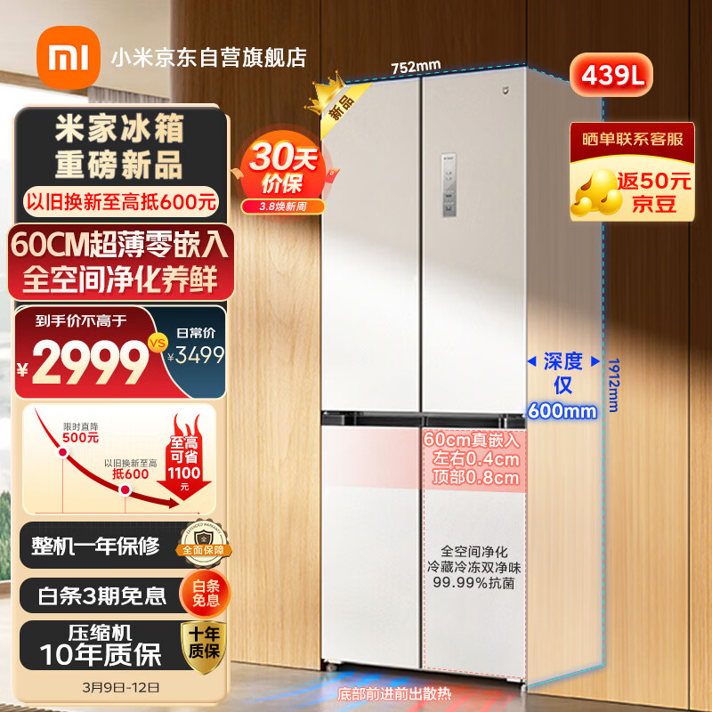 米家小米439升十字对开四开门家用电冰箱 60cm超薄零嵌入平嵌底部前置散热澎湃智联 BCD-439WMBI价格:2999.00元!