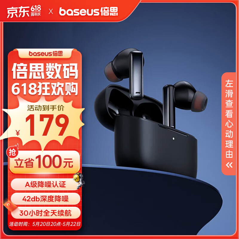 倍思M2 真无线降噪蓝牙耳机入耳式-42dB主动降噪游戏通话降噪长续航通用苹果华为oppo小米手机 黑色价格:279.00元!
