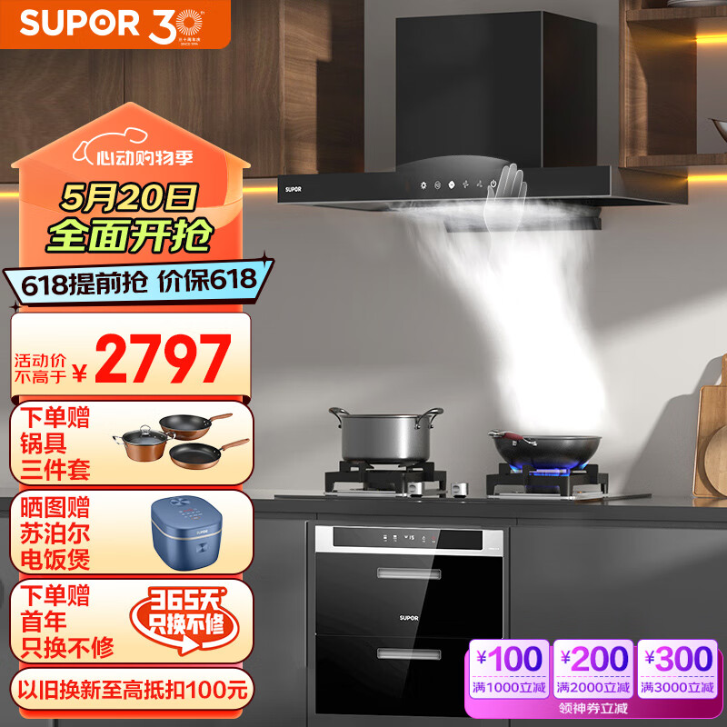 苏泊尔(SUPOR)抽油烟机燃气灶消毒柜套装 欧式家用烟灶消套装 变频挥手自清洁吸油烟机DT39+Q5天然气+508价格:2997.00元!
