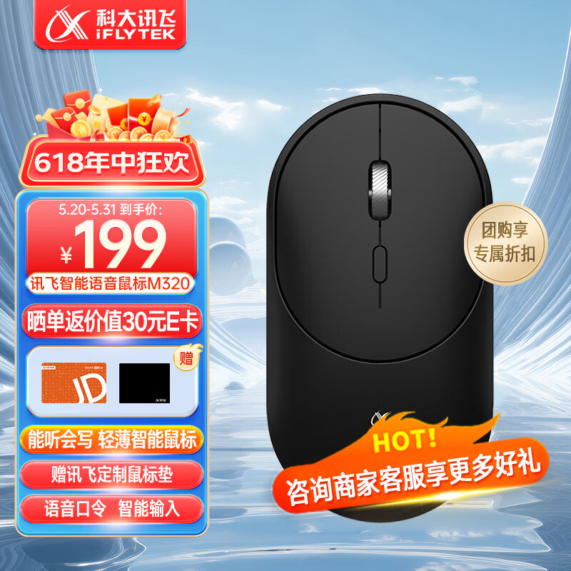 科大讯飞智能鼠标LiteM320 办公鼠标 无线外设 轻薄便携 多彩小巧 轻音按键 智能语音输入打字翻译 石墨黑价格:199.00元!