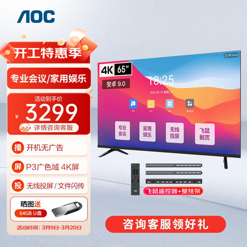 AOC会议电视4K超清会议平板一体机移动电视会议室显示屏投影投屏商用电视多媒体一体机智能显示智慧屏65英寸65NV+壁挂架+桌面支架底座价格:3299.00元!