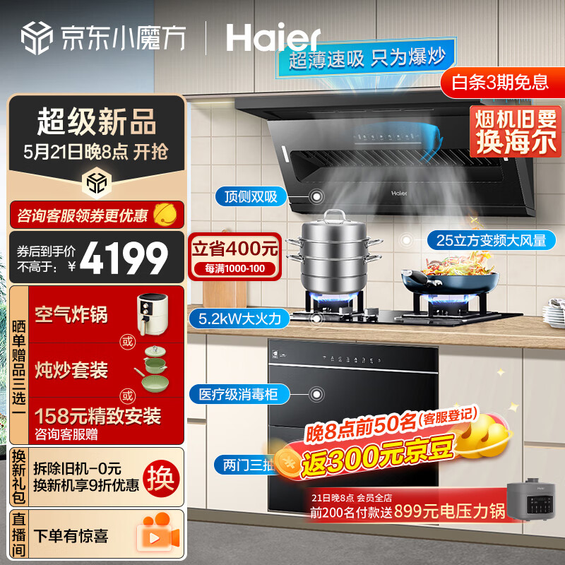海尔(Haier)抽油烟机 顶侧双吸油烟机燃气灶消毒柜套装 25m3/min大吸力 115L医疗级消毒柜C61+Q2BE3天+E07JU1价格:4599.00元!