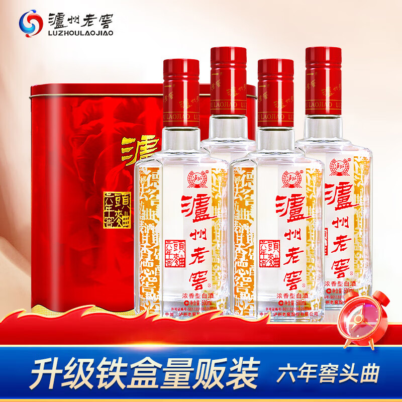 泸州老窖 六年窖头曲铁盒 浓香型白酒 52度 500ml*4瓶 礼盒装价格:349.00元!