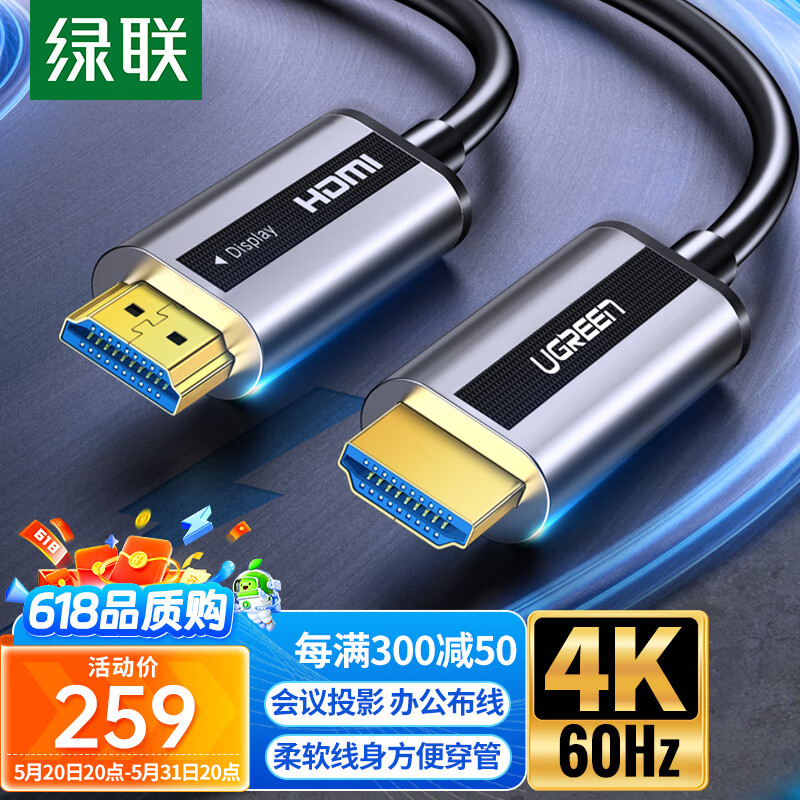 绿联光纤HDMI线2.0版 4K60Hz发烧级高清线电脑机顶盒连接电视投影仪显示器3D视频线工程装修连接线10米价格:309.00元!