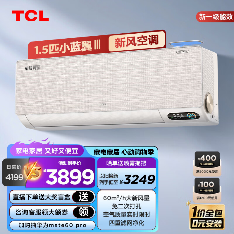 TCL新风空调1.5匹 新一级变频冷暖 60?/h 大新风量 小蓝翼Ⅲ 空调挂机 KFR-35GW/YC1Ca+B1 一价全包价格:3899.00元!