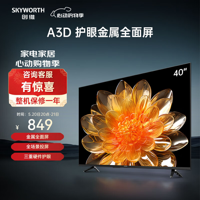 创维电视40A3D 40英寸电视机金属屏智能投屏三重硬件护眼平板液晶家用彩电43 32价格:849.00元!