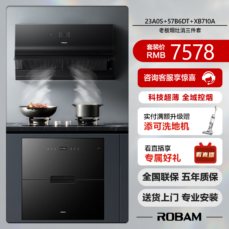 老板(Robam)抽油烟机超薄近吸家用变频24m3/min燃气灶具消毒柜烟灶消三件套23A0S+57B6DT+XB710A天然气价格:7578.00元!