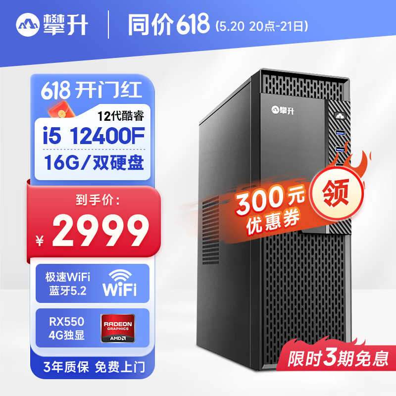 攀升商和S2 设计师办公商用台式电脑 (12代i5-12400F 16G 512G+2T 4G独显 WiFi6 )单主机全套diy组装机价格:3499.00元!