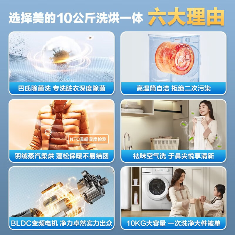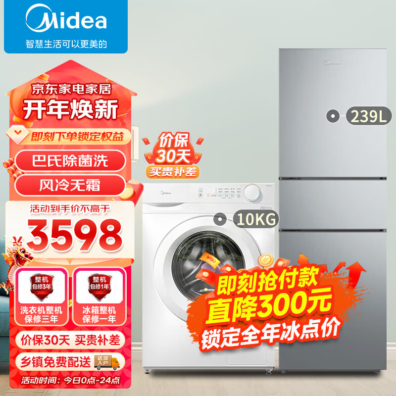 美的冰洗套装 239升三门家用风冷无霜+10公斤洗烘一体滚筒洗衣机巴氏除菌洗 BCD-239WTM+MD100V11F价格:3598.00元!