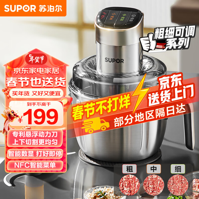 苏泊尔(SUPOR)绞肉机家用 电动多功能不锈钢悬浮刀料理搅拌机2.2L大容量馅婴儿辅食机 可调粗细搅肉机JR65-G220价格:199.00元!