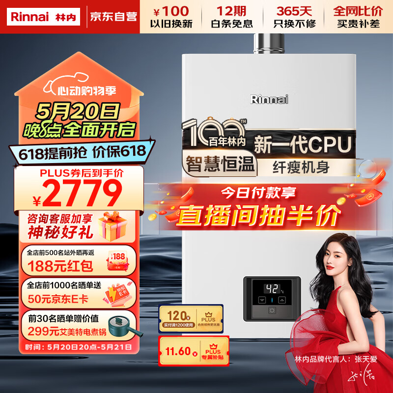 林内(Rinnai)【小蛮腰】16升燃气热水器 智慧恒温 全新升级CPU 黄金窄比 恒温系列RUS-16GD31(JSQ31-GD31)价格:2899.00元!