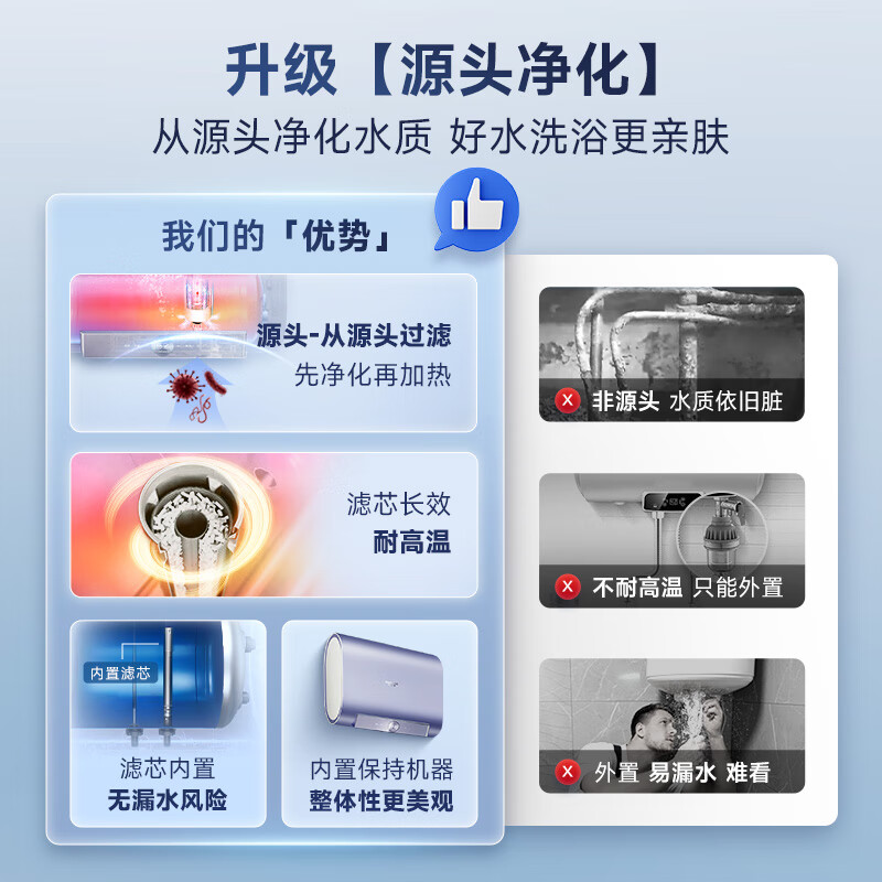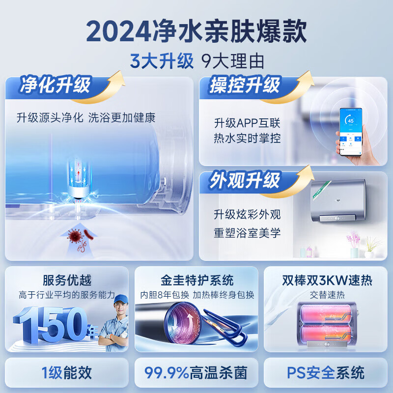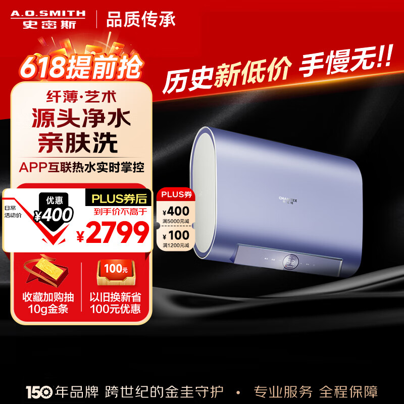 史密斯(A.O.SMITH)佳尼特【银河】60升电热水器 超薄双胆扁桶 双3kW速热 智能操控 专利免清洗 净水亲肤 CTE-60HT2价格:3199.00元!