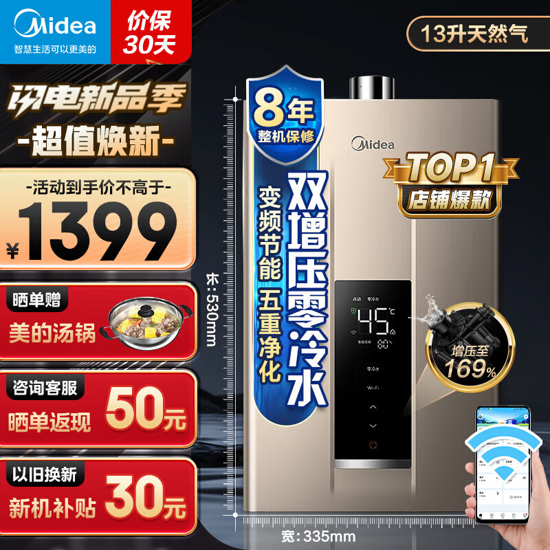 美的(Midea)零冷水燃气热水器天然气 家用即热水气双调双增压零冷水强排变频恒温省气25%智能家电NT1S系列 13升零冷水NT1S(高性价比) 天然气价格:1649.00元!