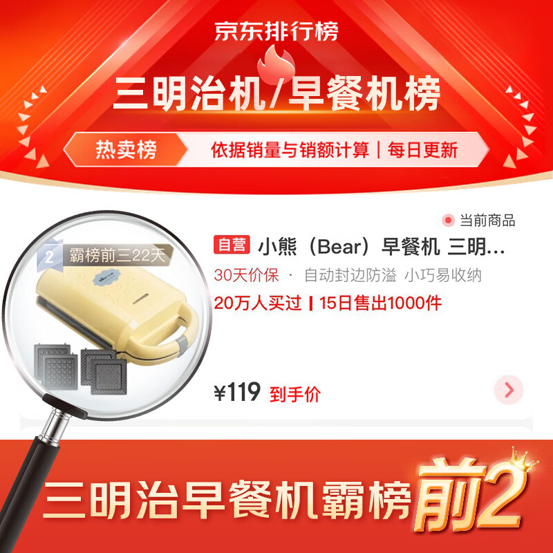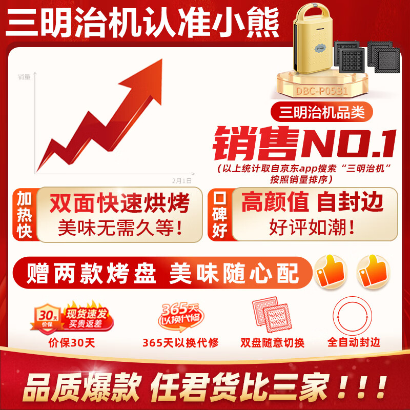 小熊(Bear)三明治机早餐机 吐司面包机华夫饼机可拆双盘配置 加厚封边多功能热压三明治机双面压烤DBC-P05B1价格:119.00元!