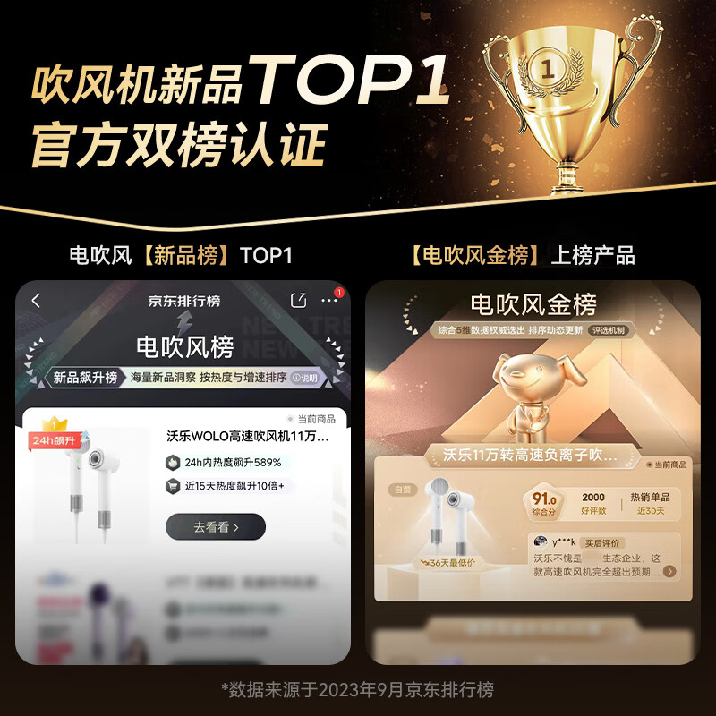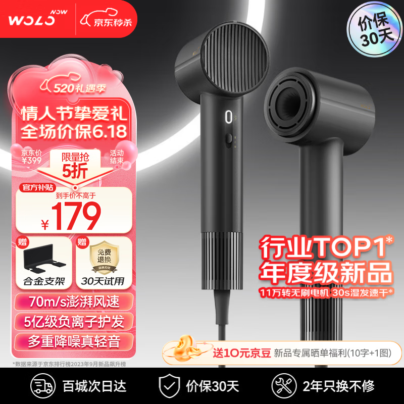 沃乐WOLO高速吹风机11万转大功率马达5亿负离子护发家用电风筒无叶大风力速干降噪礼物送女友 黑色价格:399.00元!